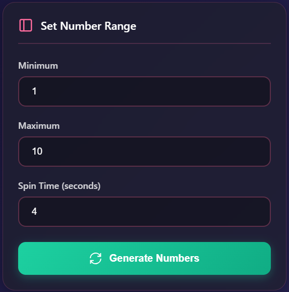Number Picker Wheel spin the wheel to get a random number instantly. Our interactive spin wheel and online random number generator makes lucky draws, raffles, giveaways, classroom picks, and decision-making effortless. Use this virtual number wheel as a random number picker, online spinner, or lucky draw spinner — set any minimum and maximum range, choose spin duration, then click SPIN to reveal a random result. The wheel includes theme switch (light/dark), fullscreen mode, sound effects, confetti celebration, and persistent spin history. Designed for mobile and desktop, this wheel of numbers supports custom ranges and fast spins. Try our number spinner, spin the wheel game, random number selector, or wheel of fortune-style number picker and watch it pick winners in seconds.